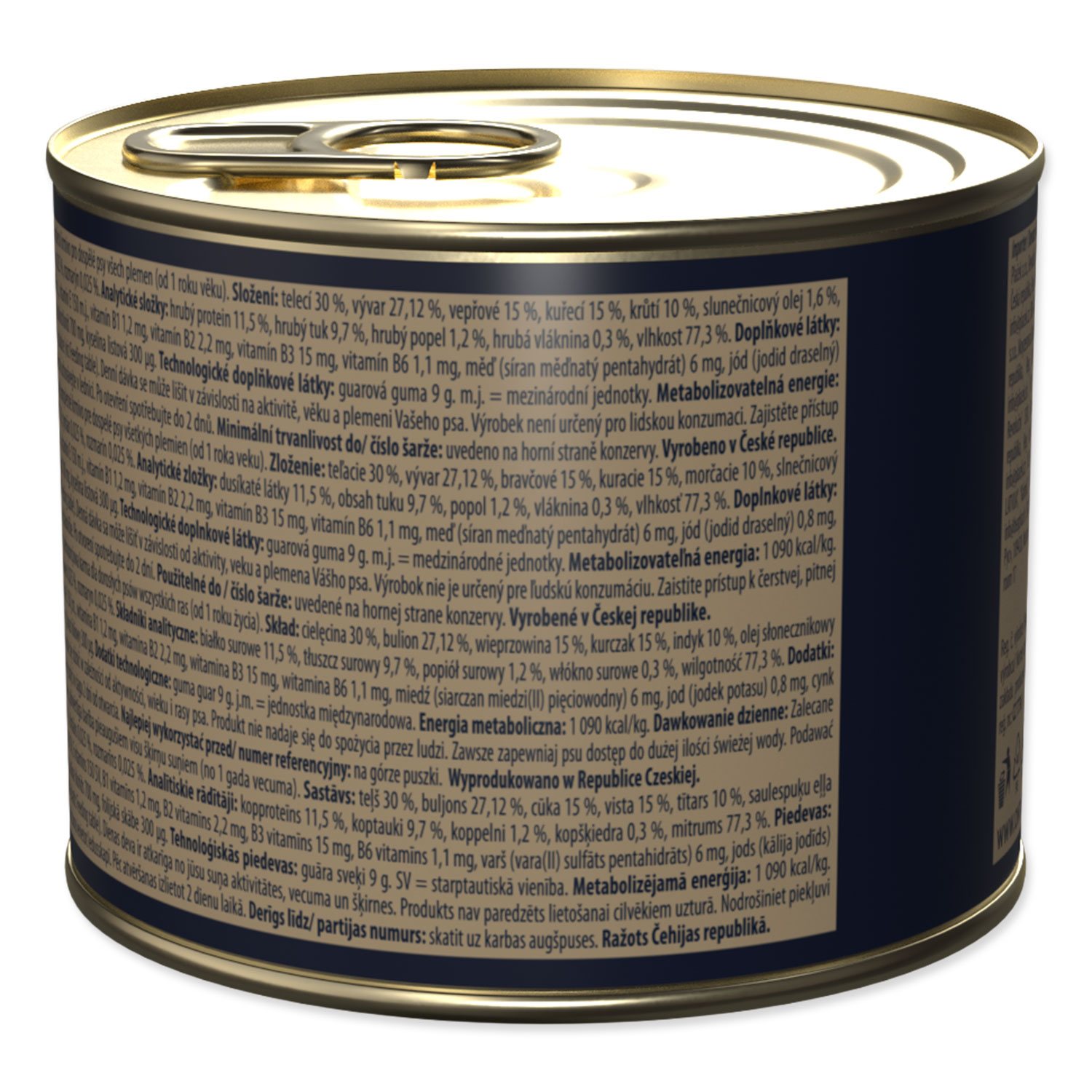 Telecí maso je jedním z nejkvalitnějších zdrojů bílkovin. Je jemné, velmi chutné a plné důležitých minerálů. Receptura s 97 % masa a vývaru je vhodná pro psy, kterým chceme dopřát něco extra, nebo potřebují lehce stravitelnou, ale výživnou stravu pro regeneraci svalů a růst svalové hmoty.