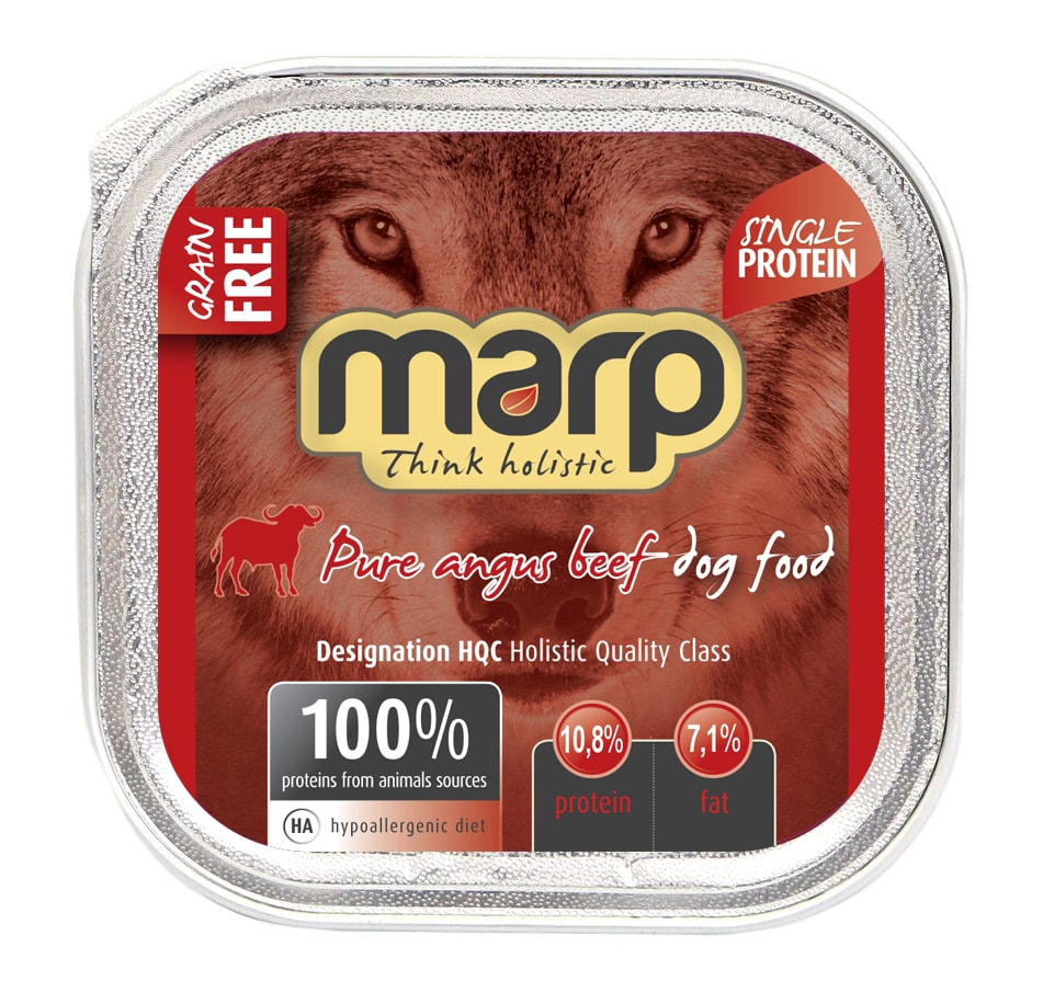 Vaničky Marp Pure obsahují 100% bílkovin ze živočišných zdrojů. Obsahují pouze maso, vnitřnosti, vývar a minerály. Nepoužíváme žádné umělé konzervanty, barviva, plnidla apod a jsou vždy bez jakýchkoliv obilovin. Vanička Marp s hovězím bez obilovin je vhodná pro psy s citlivým zažíváním a dle našich zkušeností je velmi vhodná i pro psy s potravními alergiemi.