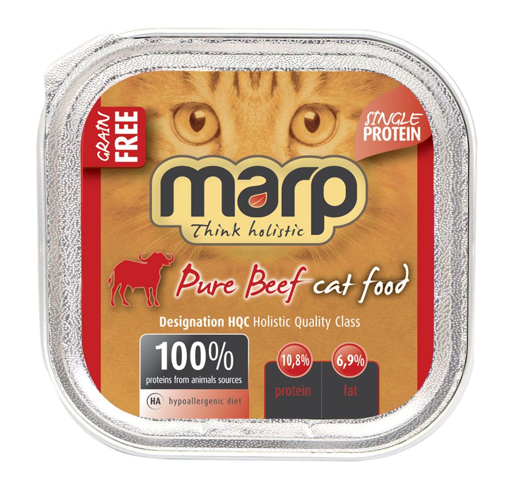 Víme, že kočka je masožravec a proto ji jako takovou ctíme. Vaničky Marp Pure obsahují 100% bílkovin ze živočišných zdrojů. Obsahují pouze maso, vnitřnosti, vývar a minerály. Nepoužíváme žádné umělé konzervanty, barviva, plnidla apod. a jsou vždy bez jakýchkoliv obilovin. Vanička Marp s hovězím bez obilovin je vhodná i pro kočky s citlivým zažíváním a dle našich zkušeností je velmi vhodná i pro kočky s potravními alergiemi.