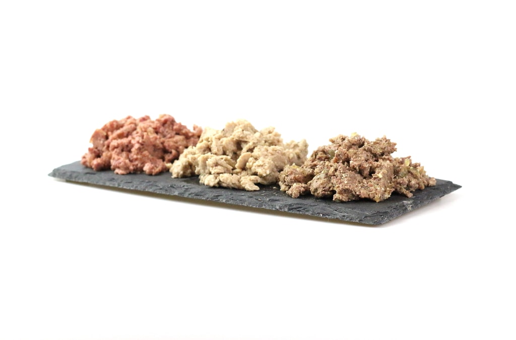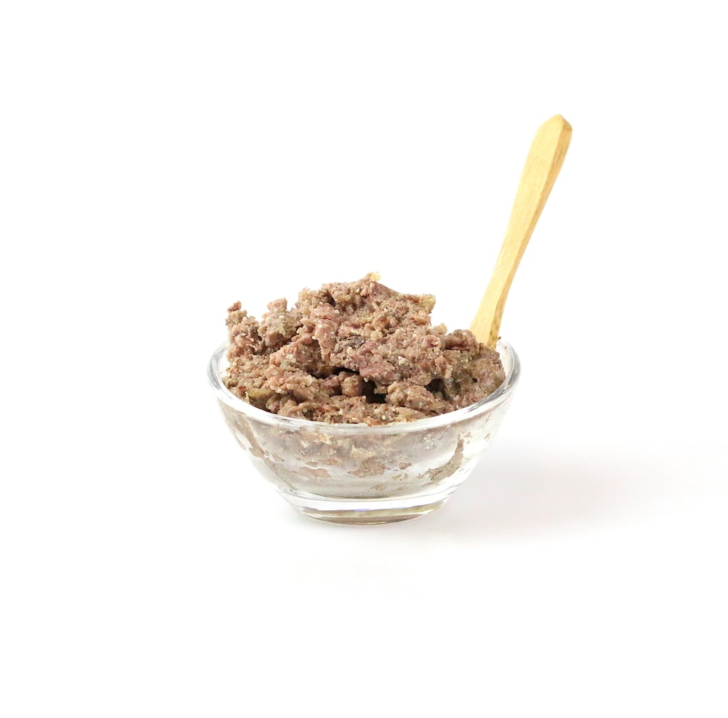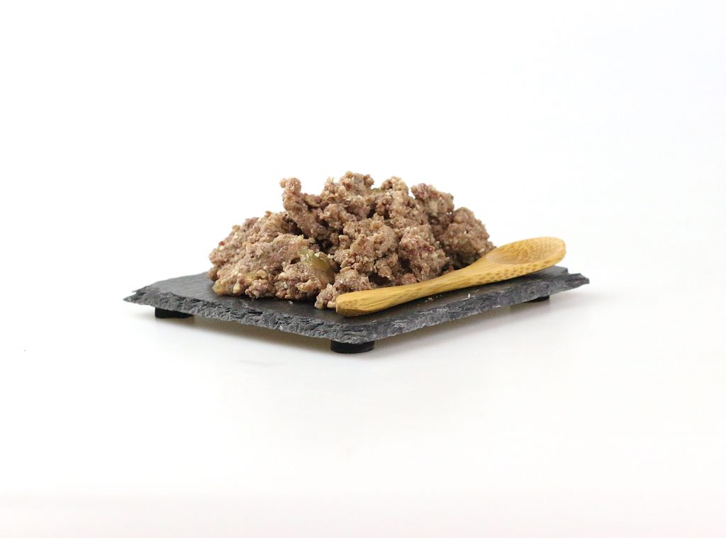 70% (Hovězí srdce, Hovězí maso, Hovězí játra, Hovězí plíce), 28,5% Vývar, 1% Minerály, 0,5% Slunečnicový olej.