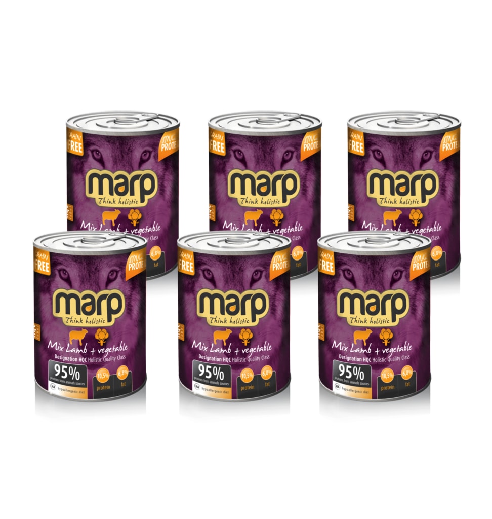 Konzervy Marp Mix obsahují 95% bílkovin ze živočišných zdrojů. Obsahují pouze maso, vnitřnosti, zeleninu, vývar a minerály. Nepoužíváme žádné umělé konzervanty, barviva, plnidla apod a jsou vždy bez jakýchkoliv obilovin. Konzerva Marp Mix s jehněčím bez obilovin je vhodná pro psy s citlivým zažíváním a dle našich zkušeností je velmi vhodná i pro psy s potravními alergiemi.